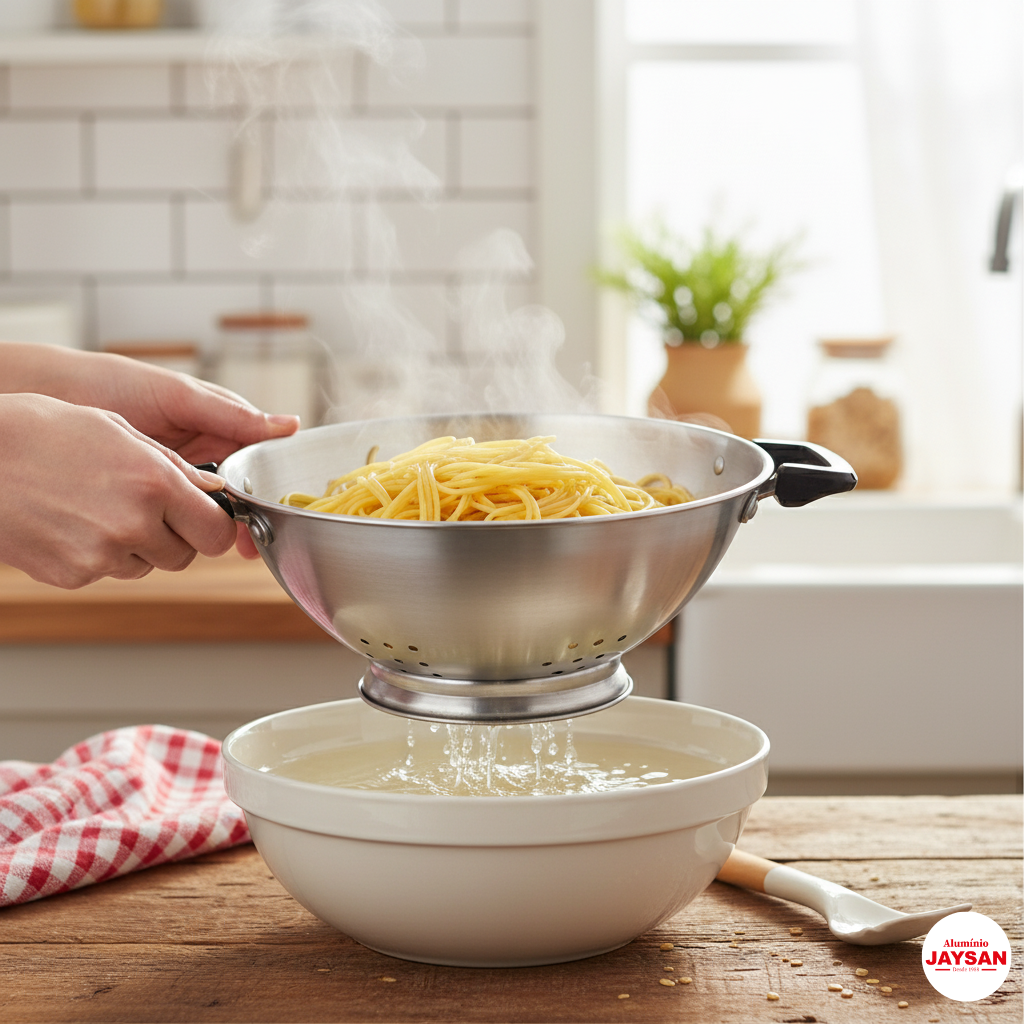 O passador de macarrão em alumínio é a ferramenta ideal para quem busca praticidade na cozinha. Com um design leve e resistente, ele é perfeito para escorrer massas de maneira eficiente.